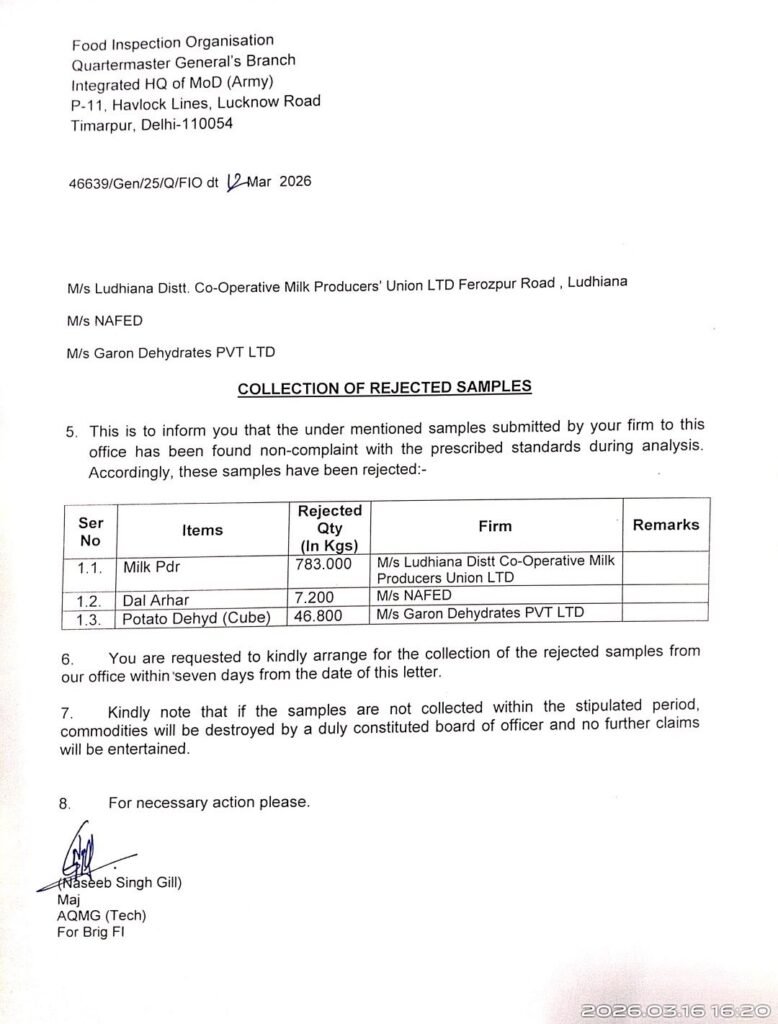 ਜੰਮੂ ਸਥਿਤ ‘ਆਰਮੀ ਸਰਵਿਸ ਕੋਰ’ (ASC) ਨੇ ਲੁਧਿਆਣਾ ਯੂਨਿਟ ਵੱਲੋਂ ਸਪਲਾਈ ਕੀਤੇ ਗਏ ਹੋਲ ਮਿਲਕ ਪਾਊਡਰ ਦੇ ਦੋ ਵੱਡੇ ਬੈਚ (58.338 MT ਅਤੇ 66.654 MT) ਰਿਜੈਕਟ ਕੀਤੇ ਹਨ। ਫੌਜ ਦੀ ਜਾਂਚ ਰਿਪੋਰਟ ਅਨੁਸਾਰ, ਇਸ ਪਾਊਡਰ ਵਿੱਚ ‘ਬਾਹਰੀ ਪਦਾਰਥ’ (Extraneous matter) ਪਾਏ ਗਏ ਹਨ, ਜਿਸ ਕਾਰਨ ਇਹ ਸਟਾਕ ਵਰਤੋਂ ਦੇ ਯੋਗ ਨਹੀਂ ਮੰਨਿਆ ਗਿਆ।