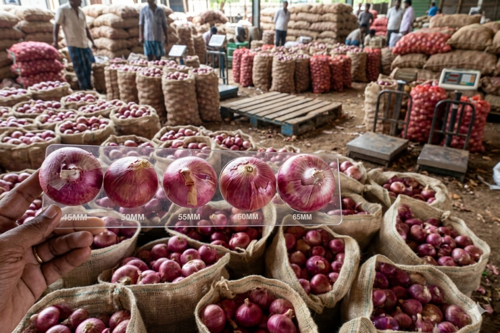 • ਘਰੇਲੂ ਬਾਜ਼ਾਰ: ਭਾਰਤੀ ਪਰਿਵਾਰ ਛੋਟੇ ਸਾਈਜ਼ (25-60 mm) ਦੇ ਪਿਆਜ਼ ਪਸੰਦ ਕਰਦੇ ਹਨ ਕਿਉਂਕਿ ਇਹ ਰੋਜ਼ਾਨਾ ਵਰਤੋਂ ਵਿੱਚ ਸੁਵਿਧਾਜਨਕ ਅਤੇ ਜ਼ਿਆਦਾ ਤਿੱਖੇ ਹੁੰਦੇ ਹਨ।