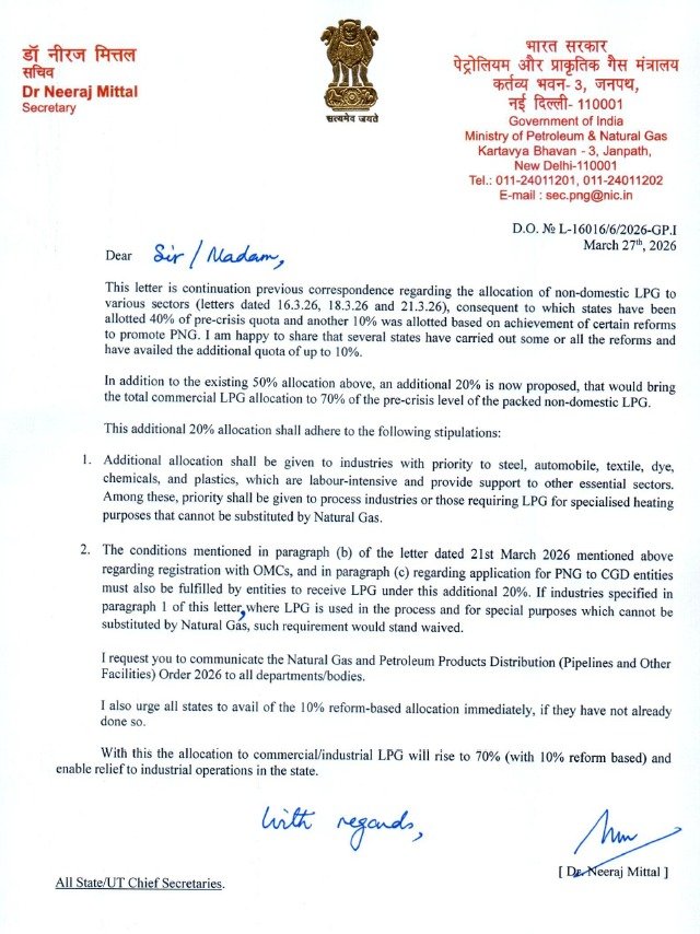 ਉਦਯੋਗਾਂ ਲਈ ਵੱਡੀ ਰਾਹਤ: ਕੇਂਦਰ ਸਰਕਾਰ ਨੇ ਵਪਾਰਕ LPG ਦਾ ਕੋਟਾ ਵਧਾ ਕੇ 70% ਕੀਤਾ; ਪੰਜਾਬ ਸਮੇਤ ਸੂਬਿਆਂ ਨੂੰ ਲਿਖੀ ਚਿੱਠੀ