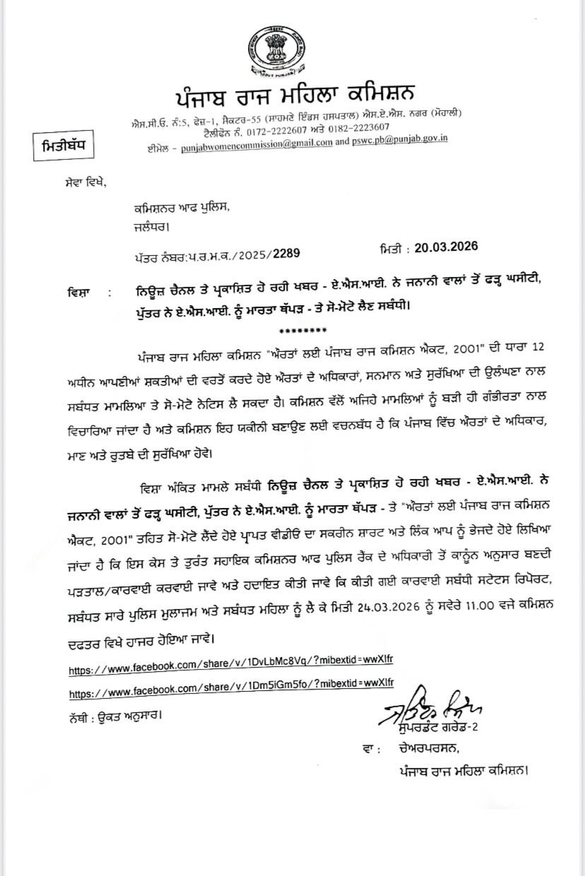ਪੰਜਾਬ ਰਾਜ ਮਹਿਲਾ ਕਮਿਸ਼ਨ ਨੇ ਜਲੰਧਰ ਪੁਲਿਸ ਨੂੰ ਭੇਜਿਆ ਨੋਟਿਸ, 24 ਮਾਰਚ ਨੂੰ ਪੇਸ਼ ਹੋਣ ਦੇ ਹੁਕਮ